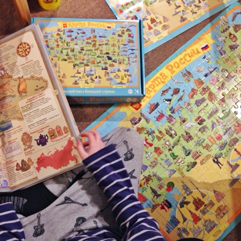Самостоятельно собрать с самого начала у Сережи не получилось, но после того, как я собрала рамку, дело пошло. Количество элементов 204, размер готовой картинки 64 на 45 см. Изображения яркие и четкие, интересно рассматривать достопримечательности, растительный и животный мир России. Все отлично, но хотелось бы, чтобы картон был потолще и попрочнее.